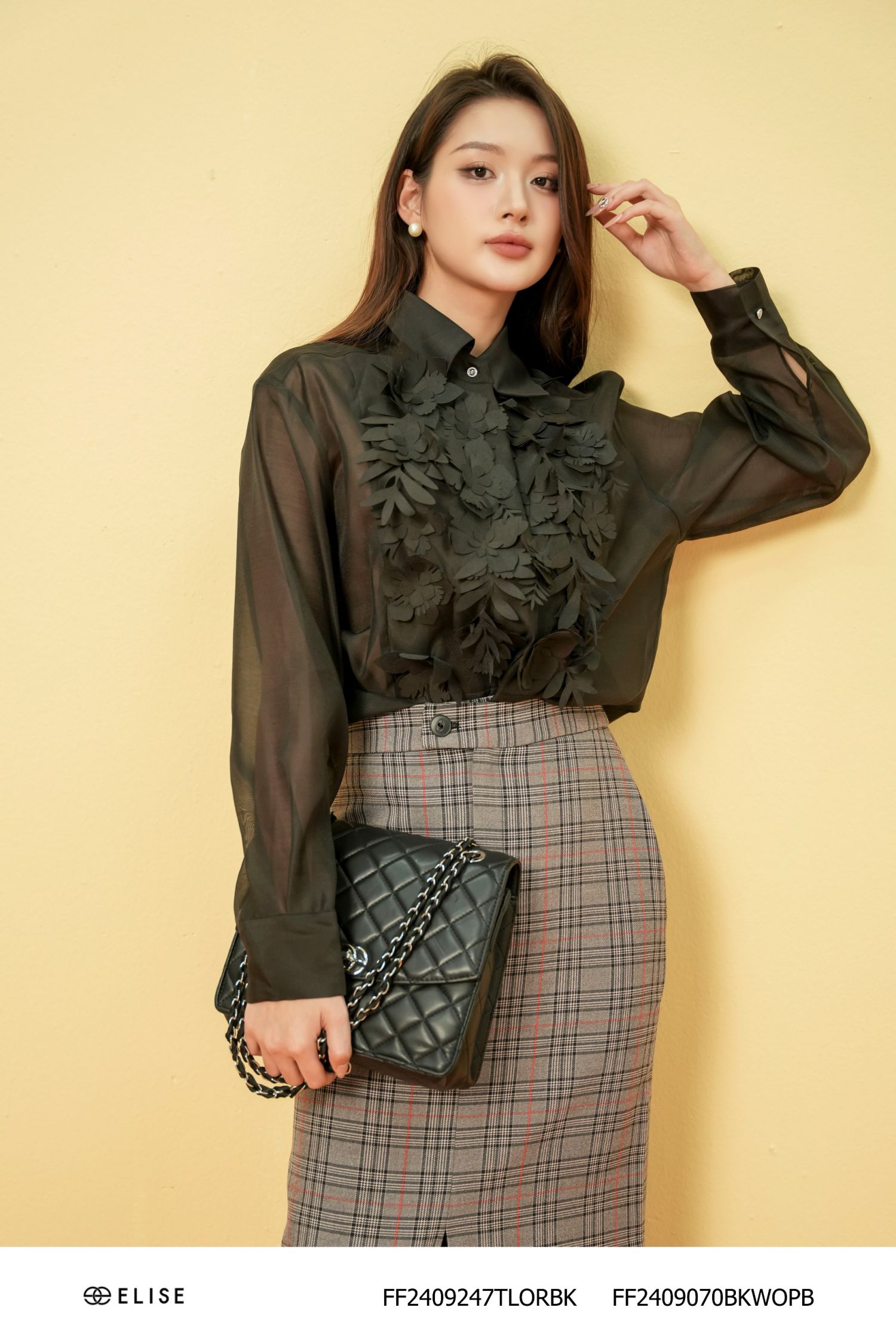 Áo sơ mi Elise gây ấn tượng với gam đen thanh lịch, chất liệu voan mỏng nhẹ tạo độ bay và mềm mại khi mặc. Điểm nhấn nổi bật là họa tiết hoa nổi 3D tinh xảo ở thân trước, mang lại vẻ nữ tính nhưng vẫn sang trọng. Thiết kế tay dài, cổ kín giúp dễ phối cùng chân váy hoặc quần âu, phù hợp đi làm, dự tiệc nhẹ hay gặp gỡ đối tác.
